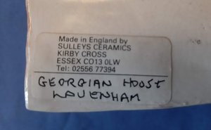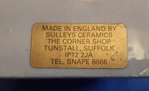 Older white stickers refer to “Sulleys Ceramics, Kirby Cross” and on occasion also have the model name hand written on them.